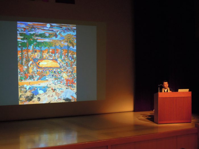 津島支部仏教会主催の第二回仏教講演会が開催されました。『釈迦涅槃図にたずねる ~お釈迦様のご生涯~』です。絵解き座から座員の村上英俊氏が出向し90分の講演を行いました。その模様は、座員の宇治谷祐司さんのブログにて報告されました。