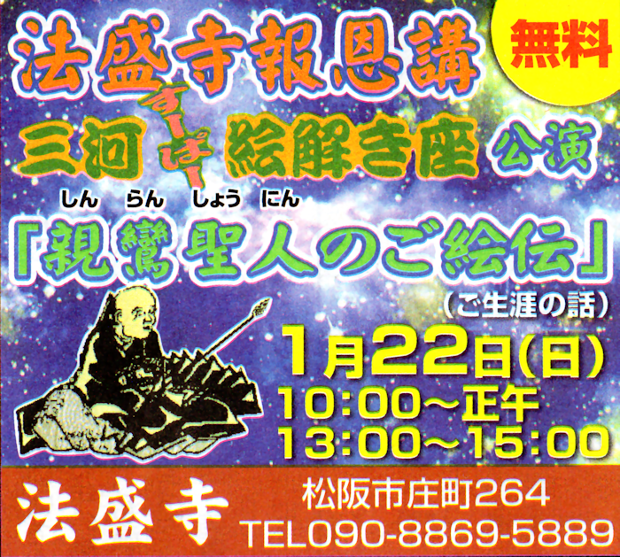 今回の報恩講は、三河すーぱー絵解き座さんの全面協力で法要を盛り上げてまいります。魅力あふれる出向者の個性にみなさま引き込まれること間違いなし!