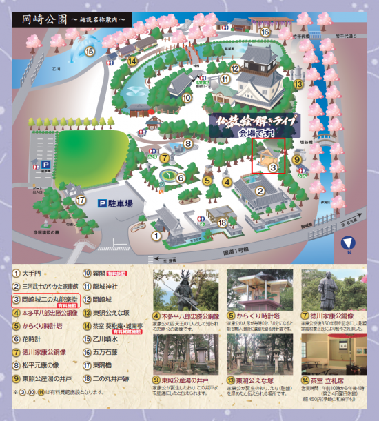 岡崎城までの交通案内 公共交通機関の場合 名鉄「東岡崎駅」より徒歩15分 愛知環状鉄道「中岡崎駅」より徒歩15分 名鉄東岡崎駅よりバス「大樹寺行き」乗車→「康生町」下車→徒歩5分 JR岡崎駅よりバス「康生町方面行き」乗車→「康生町」下車→徒歩5分 車でお越しの場合 東名高速道路「岡崎I.C.」より名古屋方面へ3km(国道1号線沿い) 岡崎城二の丸能楽堂のご案内