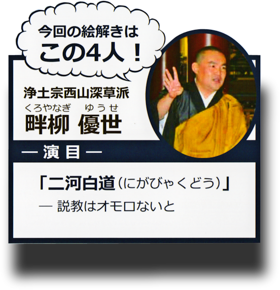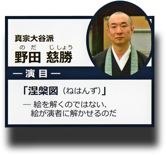 2005 愛・地球博出演。屋外・ライブハウスなど、辛い場所で絵解きを行い、自分をいじめ抜く。今回はお釈迦様入滅のエピソードとすぐにできる仏法エクササイズを「涅槃図(ねはんず)」に尋ねます。稲沢市在住