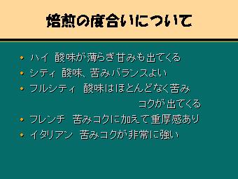コーヒー豆屋さんへ行くといろいろな色のコー ヒー豆があることに気付かれるでしょう。 これは焙煎の度合い(深さ)の違いによるもの です。焙煎が深いものほど色が濃く黒ぽっくな ります。これによりコーヒーの味・香りが変わっ てきます。(左図参照:イタリアンが一番深煎り なります。) 一般的に焙煎の度合いは8段階に分けられど の段階でコーヒー豆を仕上げるかは焙煎する 人にゆだねられます。 (左図:ハイ・ローストの前にライト、シナモン、 ミディアム・ローストがあります。) ですから同じ銘柄の豆でも店によって味が違っ てくるのです。 |