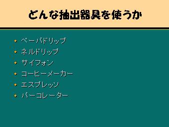 コーヒーをいれるにはいろいろな方法がありま す。それぞれ特徴があり「これでなくては」とい うものはありません。自分にあったやり方で楽 しんで下さい。 ペーパードリップ・・・一番普及している方法。 コーヒーの味がストレートに出る。いつも一定 の味を出すのが難しい。 ネルドリップ・・・蒸らし効果がよく、上手にいれ ればマイルドなおいしいコーヒーが作れる。 ネルの保存が面倒。 サイフォン・・・演出効果バツグンの方法で人 気あり。どちらかというと平坦な味になりがち。 コーヒーメーカー・・・忙しい時など手軽にいれ られ便利。ただ蒸らし効果を得られずコーヒーの おいしい成分が抽出されにくい。 エスプレッソ・・・蒸気圧で抽出する。苦みの強 いコーヒーが特徴。 パーコレーター・・・アウトドアで簡単に抽出で きる。ポットの中でお湯を循環させ抽出する。 煮詰めないように・・・ |